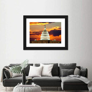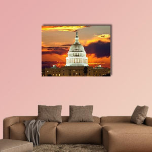 Sunset At United States Capitol Building in Washington DC shows the Capitol dome and its lit facade bathed in warm orange and yellow sunset light, with a centered composition and an equestrian statue in the foreground. The palette of orange, yellow, white and dark grey creates a majestic, dramatic atmosphere. This architectural canvas fits modern living rooms, offices, or entryways.