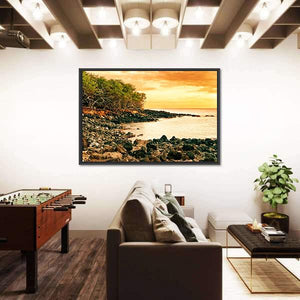 A realistic Hawaiian coastal scene of rocky shoreline, dense foliage, water and sky at sunset. An overcast sky carries warm orange tones while the rule-of-thirds composition creates a calm, serene, and tranquil atmosphere. Suits house room decor in modern or natural-style interiors.