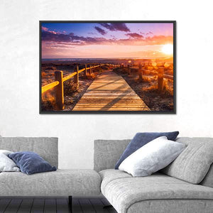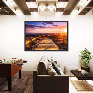 Sunset Beach Near Almeria shows a wooden boardwalk and fence leading to the ocean under a dramatic sunset sky. The orange, purple, blue and brown palette gives a serene, warm mood. It suits warm, rustic or modern rooms as calming wall art.