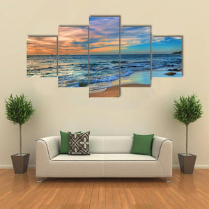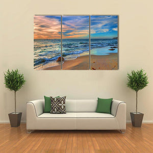 Bring a piece of Perth's coastline into your home with this serene canvas art. The tranquil scene captures ocean waves gently lapping against the shore under a sky filled with dramatic clouds, evoking a peaceful atmosphere.
