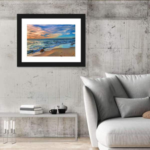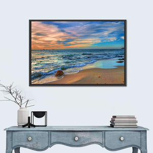 This canvas captures the serene beauty of Sunset Beach in Perth, showcasing the vibrant hues of the sunset over the ocean. The dynamic cloud patterns and a solitary rock in the surf evoke a peaceful atmosphere, making it a perfect addition to any nature-themed decor.