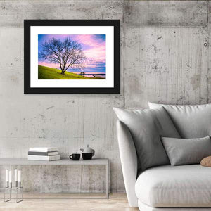 This canvas wall art depicts a bare tree silhouetted against a serene sunset in Tajikistan. The tranquil scene, featuring a grassy hill and clouds reflected in a water body, invites a peaceful atmosphere to any space.