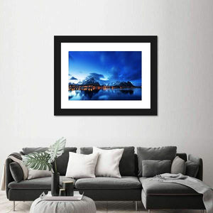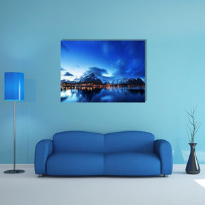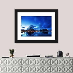 Sunset in Reine Village in the Lofoten Islands presents a wide landscape of snow-capped mountains, a quiet village and a reflective body of water beneath a streaky night sky. The blue, white, orange and black palette gives the scene a serene, dramatic and majestic mood with village lights mirrored in the water. Works well in modern living spaces or rooms seeking peaceful, nature-inspired wall decor.