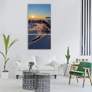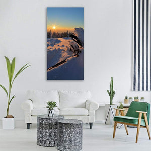A snowy landscape at sunset with the sun near the upper-left, shown as a starburst above snow-covered trees and a fallen log in the foreground. The blue, yellow, white, orange and brown palette creates a serene, cold, bright atmosphere. It pairs well with modern or nature-inspired room decor.