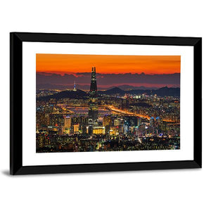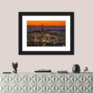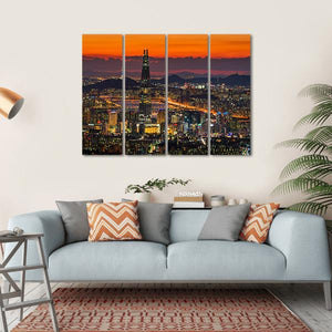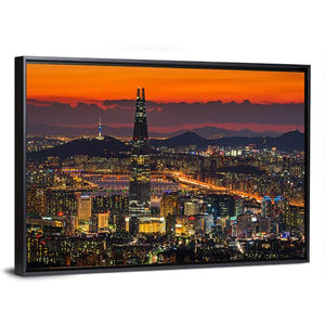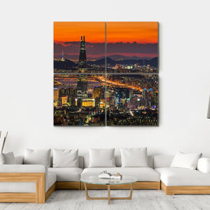 This vibrant canvas art captures the energetic skyline of Seoul at sunset. With tall skyscrapers illuminated against a backdrop of orange and purple striped clouds, it perfectly embodies urban life. Ideal for adding a modern touch to your wall décor.