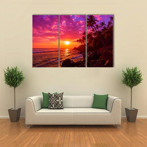 This canvas art captures a serene ocean sunset, featuring silhouetted palm trees against a vibrant palette of purple, orange, and pink. Ideal for adding a touch of nature's beauty to any modern decor.