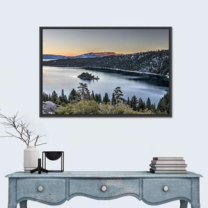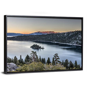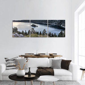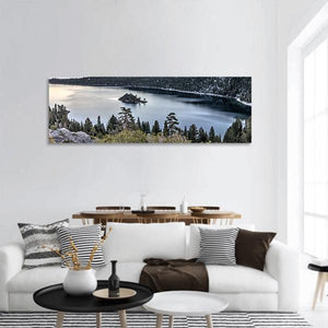 Sunset On Emerald Bay captures a snow-dusted island and surrounding pine trees on a calm lake, presented as a wide panoramic landscape. Cool blues, greens, grays, and whites lend a serene, natural winter light and an elevated perspective. The print works well in modern or neutral-toned rooms and pairs with nature-inspired décor.