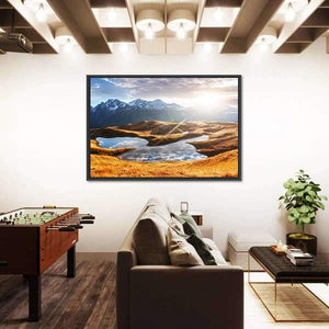 This canvas art captures the serene beauty of a sunset over Koruldi Lake, framed by majestic mountains. The naturalistic landscape features vibrant hues of blue, gold, and white, evoking a peaceful atmosphere that invites contemplation.