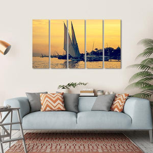 This canvas depicts a serene sunset over the Nile River, featuring sailboats gently drifting along the water. Its warm palette of oranges, yellows, and blues creates a peaceful atmosphere, making it a lovely addition to any room decor.