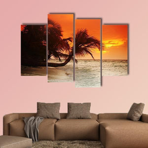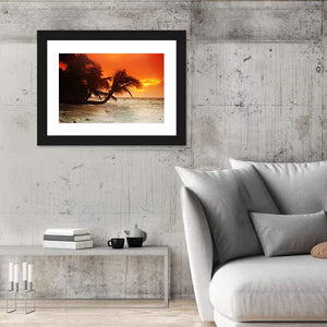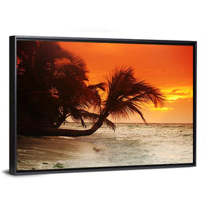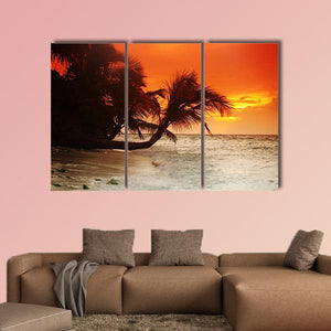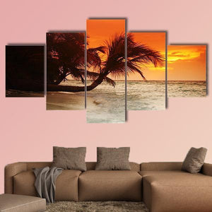 A photographic beach scene that captures a warm sunset over the sea with a leaning palm tree and gentle waves. The rule-of-thirds composition and a palette of orange, yellow, brown and white give the image a tranquil, serene mood. Works well as relaxed wall decor in a beach house or modern living room.