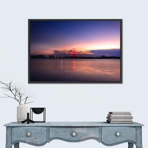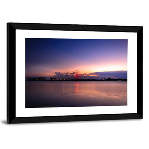 Sunset On The River Han shows a glowing Ferris wheel on a calm waterfront at sunset, with the horizon line and soft reflections across the water. Rendered in purple, orange, blue, pink and gray, this modern landscape feels peaceful and romantic and pairs well with modern home décor in living rooms or bedrooms.
