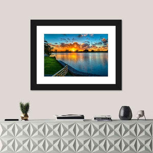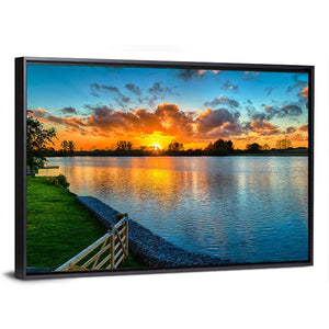 This canvas features a stunning sunset over a tranquil lake, framed by a grassy field and a wooden fence. The serene colors of blue, orange, and yellow create a warm, inviting atmosphere, perfect for nature lovers.