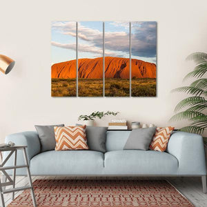 This photorealistic canvas shows Uluru (Ayers Rock) at sunset, with sunlight warming the rock and a partly cloudy sky above. The wide-angle composition and warm orange-red palette create a serene, majestic sense of vast desert that suits modern or nature-inspired interiors.