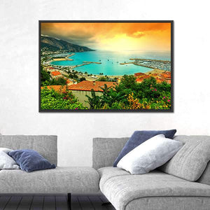 Capture the serene beauty of a coastal town in France with this stunning canvas print. Featuring vibrant red tiled roofs against a backdrop of clear blue water and an orange sunset sky, it's a picturesque addition to any space.