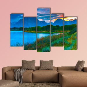 Oxbow Bend Turnout Canvas Wall Art shows mountains, a calm lake, trees and a sky streaked with dramatic clouds and sunset colors. The vibrant blue, green, orange and purple palette and rule-of-thirds composition create a serene, dramatic mood that suits modern living rooms and nature-themed spaces.