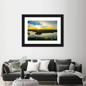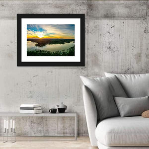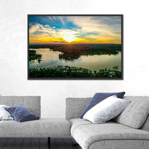 This vibrant canvas art captures a serene sunset over Lake Wwylie in South Carolina, showcasing a beautiful blend of blues, yellows, and oranges. The tranquil scene features wispy clouds and the gentle wake of a boat on the water, making it a perfect addition to any nature-inspired décor.