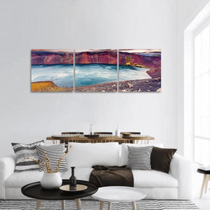 A wide panoramic view of a volcanic crater lake ringed by striking red and purple rock formations and distant mountains at sunset. The vivid blue lake and layered tones of red, brown, yellow and grey give a dramatic yet serene, natural mood. Suited to modern living rooms or nature-themed wall decor.