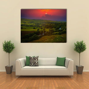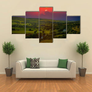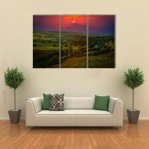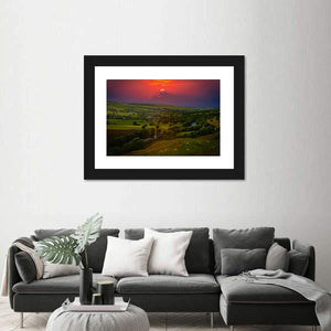 This vibrant landscape artwork features rolling hills and a serene river beneath a dramatic sunset. The warm palette of red, green, blue, and gold captures a peaceful summer mood.
