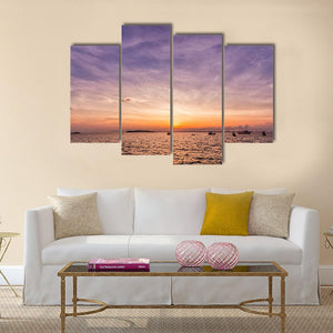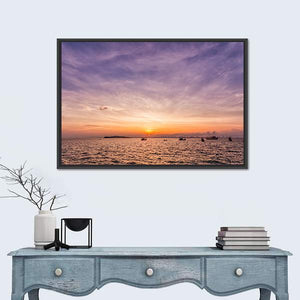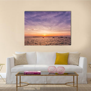 Sunset Over Ocean Beach Canvas depicts an ocean sunset with boats beneath wispy clouds. Purples, oranges and pinks wash the calm water to create a serene, peaceful scene. The realistic composition pairs well with modern home decor and suits living rooms or bedrooms.
