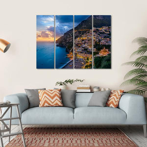 This canvas art beautifully captures a serene sunset over Positano, a picturesque coastal village on the Amalfi Coast. With its warm palette of blue, orange, and green, it invites a tranquil atmosphere, making it a lovely addition to your home décor.