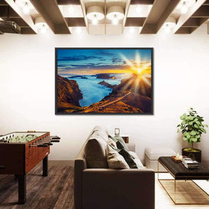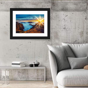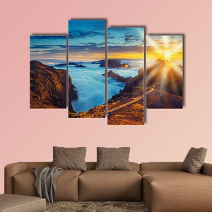 Sunset Over The Mountains In Portugal places mountains, clouds and the sun front and center, with sun rays piercing a sea of clouds for a dramatic, majestic view. Rendered in blue, orange, yellow and brown tones, the landscape gives a serene, awe-inspiring mood that suits modern or nature-themed wall decor.