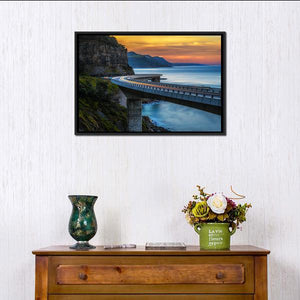 A photorealistic view of a coastal highway bridge, cliffs and the Pacific Ocean at sunset, with vibrant orange and turquoise tones and reflective water. The scene reads dramatic yet serene and suits modern living rooms or hallways that favor nature-focused wall art.