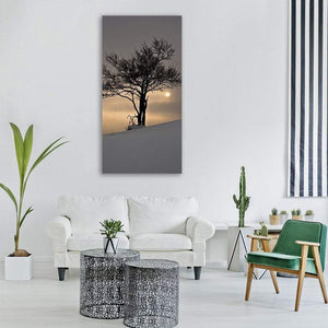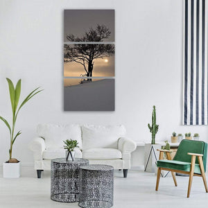 A centered landscape of a bare tree on a snowy hill beneath a low winter sun. The gray and white palette with hints of yellow and brown creates a somber, serene mood that pairs well with modern or minimalist room decor.