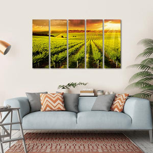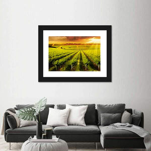 Capture the essence of a serene vineyard sunset with this landscape canvas art. Featuring rolling hills and rows of grapevines under dramatic clouds, it creates a warm atmosphere reminiscent of golden hour. Perfect for nature lovers.