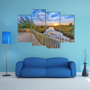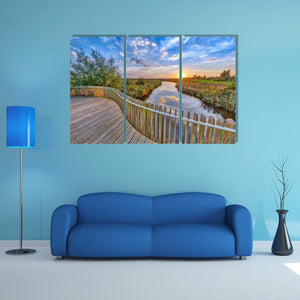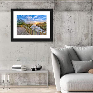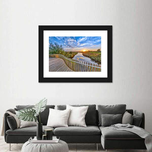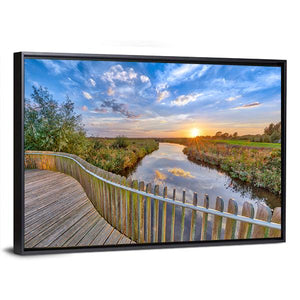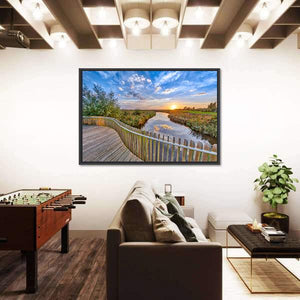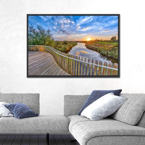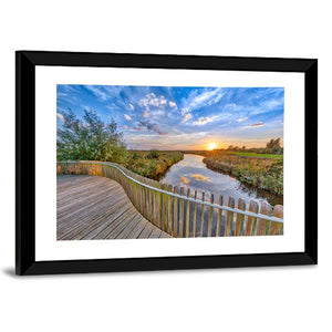 A wooden boardwalk curves left along a bridge at sunset, passing marshland and a calm river that reflects the sky. Rendered realistically in blue, orange, green and brown tones, the scene has a serene, peaceful, natural mood and fits well as relaxed room decor for a living room or entryway.