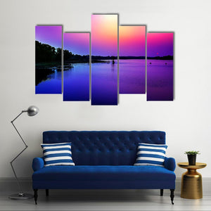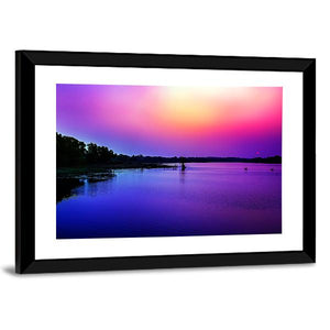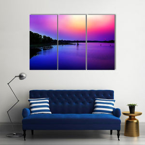A tranquil sunset over a river with silhouetted trees and a calm water surface. The modern landscape uses a purple-to-orange gradient sky and a rule-of-thirds composition to create a serene, vibrant mood. Suits modern living rooms or bedrooms as subtle room decor.