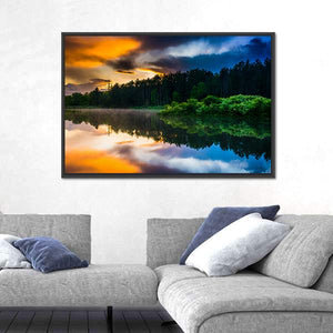 Sunset Sky Reflecting In A Pond shows a lake edged by a dense forest, with dramatic clouds and sunset colors mirrored across the water. The image reads as both dramatic and serene, rendered in vibrant orange, blue, green, gray and yellow tones with mist on the water. It works well as a focal wall art piece in modern or nature-inspired rooms.