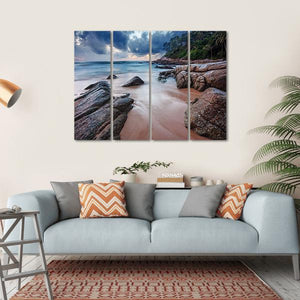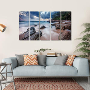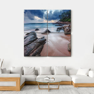 Experience the calm of a tropical beach at sunset with this canvas wall art. The dramatic play of dark clouds against serene reflections in the wet sand evoke a peaceful yet moody atmosphere, perfect for enhancing any space.
