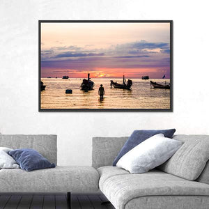 A photorealistic panoramic print of a sunset over the sea, showing anchored boats and a lone silhouette in the water. Soft pink, orange, purple and blue tones create a serene, reflective mood that works well in modern living rooms or coastal-inspired spaces.