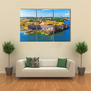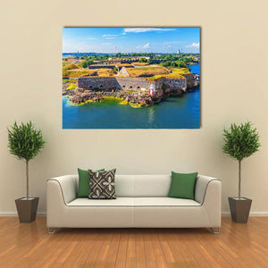 This beautiful canvas art features the Suomenlinna Sveaborg Sea Fortress in Helsinki, showcasing an aerial view of its historic stone walls and the iconic red and white lighthouse. Its serene and bright palette of blue, green, and brown invites a sense of calm, making it a charming addition to any wall.