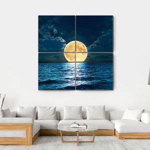 This canvas features a serene landscape of a full moon casting its magical reflection on calm waters. With a palette of blues and soft yellows against dark clouds, it invites tranquility into any space.