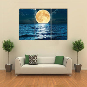 This canvas art captures a serene and mysterious night sky with a full moon reflecting on the ocean's surface. The dramatic colors of blue and orange convey tranquility, making it a lovely addition to your wall decor.