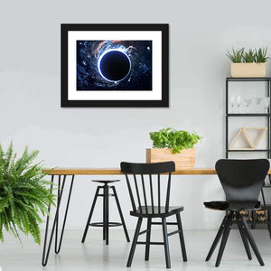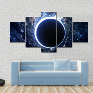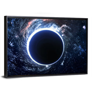 Explore the mysterious depths of the cosmos with this abstract canvas featuring a striking black hole, glowing accretion disk, and a starry background. Its modern design and bold color palette of black, blue, white, and red evoke a sense of awe and wonder.