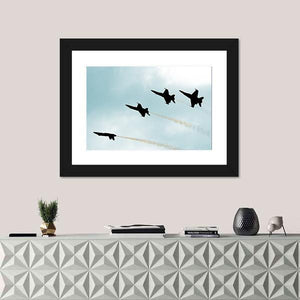 This striking canvas features four jet planes flying in formation, leaving dynamic smoke trails against a bold black, white, and gray palette. Its modern silhouette design captures a powerful aerial mood, making it a captivating addition to any space.