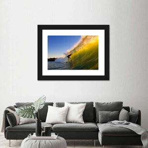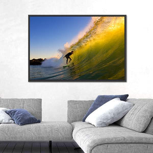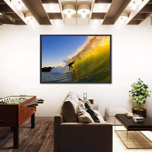 The Surfer at Sunset Canvas Wall Art captures the exhilarating energy of surfing against a vibrant backdrop of sunset colors. This dynamic piece features a skilled surfer in a wetsuit, riding the waves with sunlight illuminating the spray around them. It's a stunning homage to the ocean, making it a fitting addition to any nature-inspired décor.