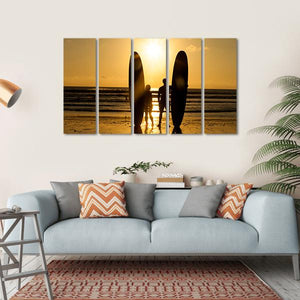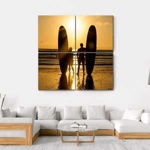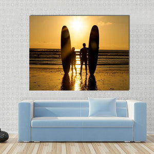 This canvas artwork beautifully captures a peaceful moment between a surfer couple on the beach at sunset. The silhouettes of the two figures and their surfboards against a warm palette of gold and orange create a serene and romantic atmosphere, perfect for enhancing your wall decor.