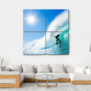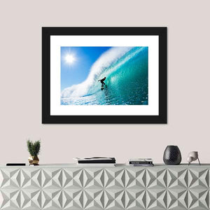 This piece captures the dynamic energy of surfing, featuring a silhouette against a crashing ocean wave and a vibrant sun. The palette of blue, teal, and yellow evokes a sunny, exhilarating atmosphere that’s perfect for brightening any space.