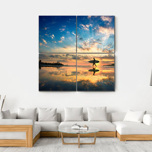 Capture the essence of a serene beach sunset with this stunning canvas art featuring a silhouetted surfer against a backdrop of vibrant blue and orange hues. The tranquil scene, enhanced by sun rays filtering through clouds and a mirror-like reflection on wet sand, brings a sense of calm and awe to any space.