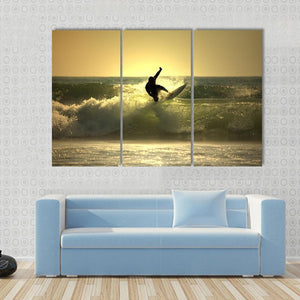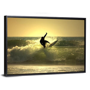This canvas art captures the dynamic silhouette of a surfer riding a wave at sunset, surrounded by vibrant gold and green hues. It's an exciting piece that adds energy to your space.