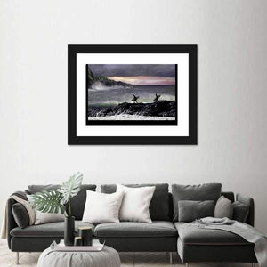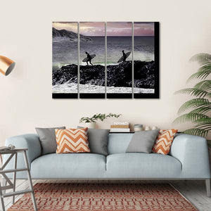 This canvas art captures two surfers walking along a rocky shore under a dramatic stormy sky. The piece features dark blues and greys contrasted with purples and tans, reflecting the powerful atmosphere of crashing ocean waves. Its bold imagery makes it a stunning centerpiece for any room.
