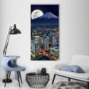 A vertical canvas showing Yokohama’s city skyline beneath a starry night, a full moon, and a snow‑capped mountain peak rendered in a modern photorealistic style. Deep blues, gold, grey, and white give the scene a majestic, serene yet dramatic urban mood; it suits contemporary living rooms or offices as a focal wall piece.