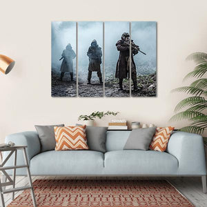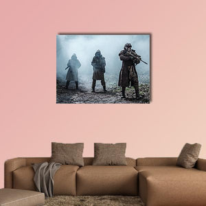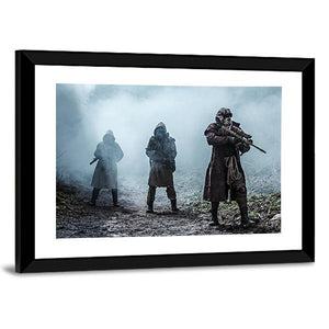 This striking canvas art depicts soldiers clad in heavy coats and gas masks, navigating a tense, apocalyptic landscape filled with smog. The dramatic palette of browns, grays, and blues enhances the ominous atmosphere, making it a compelling addition to your wall decor.