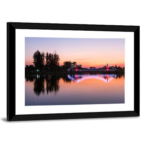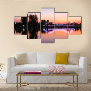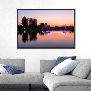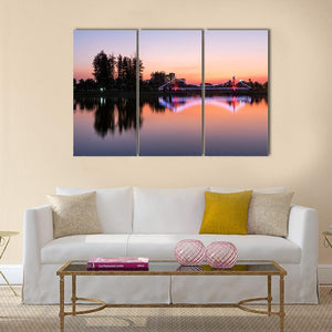 This canvas captures a suspension bridge at sunset, with its lights and nearby trees reflected in calm water for a serene, colorful scene. The symmetric composition and purple‑orange‑pink palette give a peaceful, modern vibe that works well in contemporary living rooms or bedrooms.