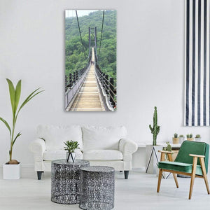 Suspension bridge cuts through a deep, green forest with two figures walking toward a clear vanishing point. The realistic scene, rendered in greens, browns and grays, feels serene with a hint of adventure and works well in modern or nature-inspired rooms.