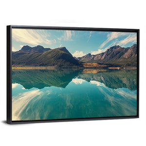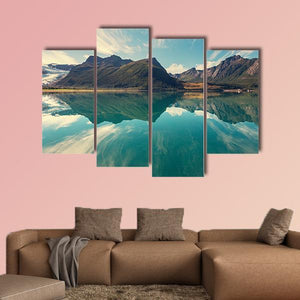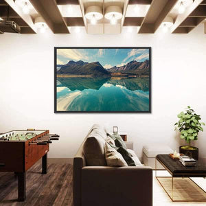 Svartisen Glacier in Norway appears as a realistic mountain-and-lake scene, with a vivid reflection of the mountains and clouds on the water. Cool blues, greens, browns and greys give the print a serene, majestic mood that works well in modern homes and nature-inspired rooms.