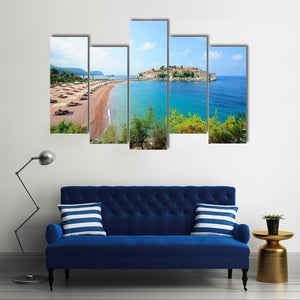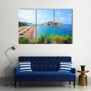 This canvas art captures the serene beauty of Sveti Stefan Island, featuring a picturesque beach scene with rocky buildings and colorful umbrellas. With its tranquil palette of blues and greens, it adds a refreshing touch to any space.
